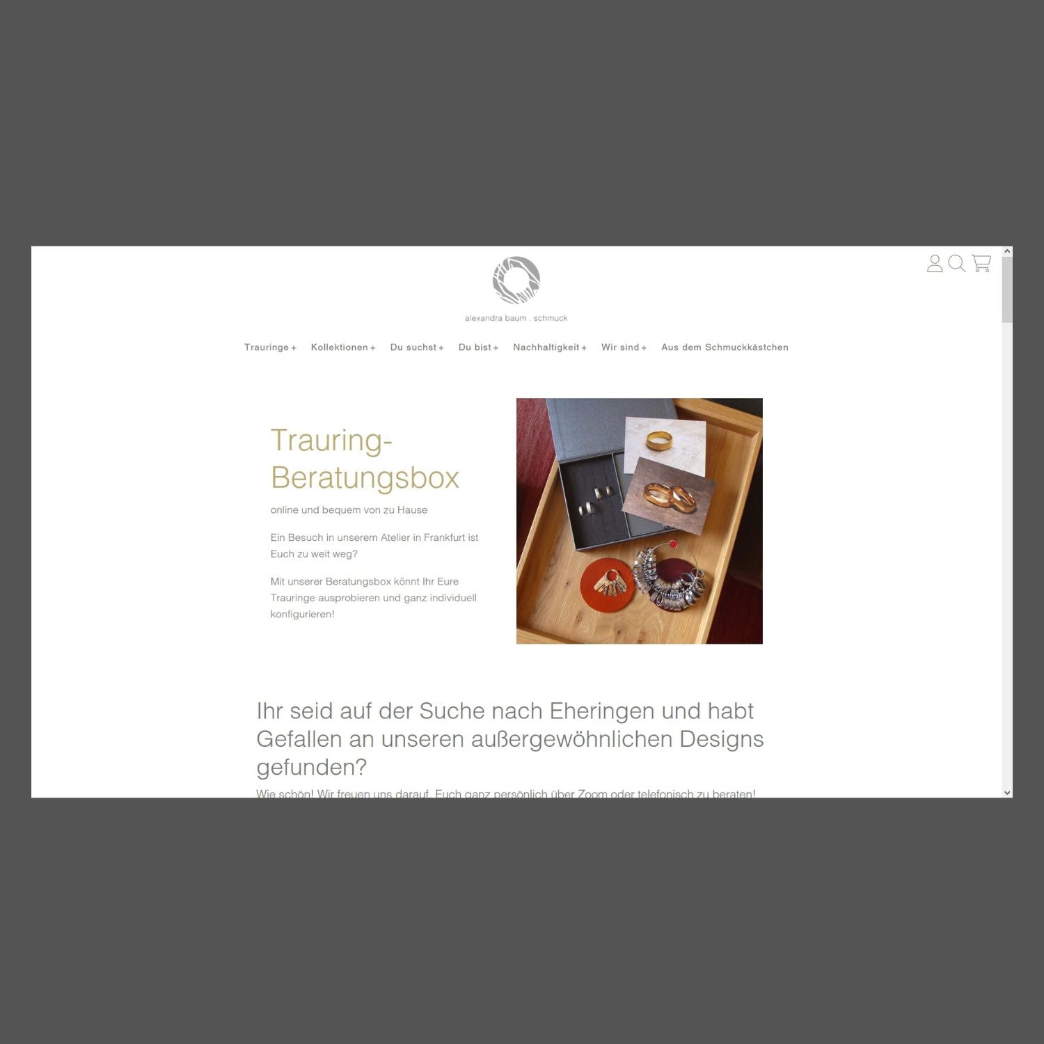 Damit war es 2022 an der Zeit, diesen Online-Shop zu eröffnen! Um meine Trauringkunden im Shop auch auf die Entfernung gut beraten zu können, habe ich die Trauring-Beratungsbox entwickelt, mit der meine KundInnen ihre Ringe bequem zu Hause auf dem Sofa aussuchen können.