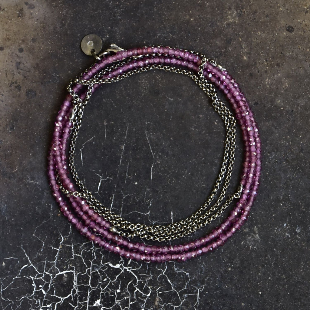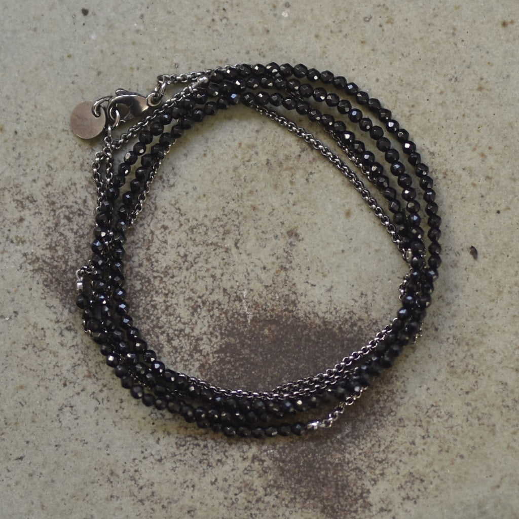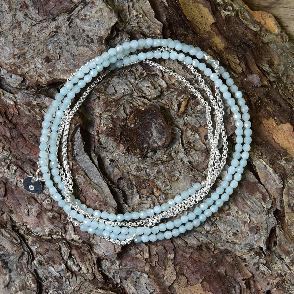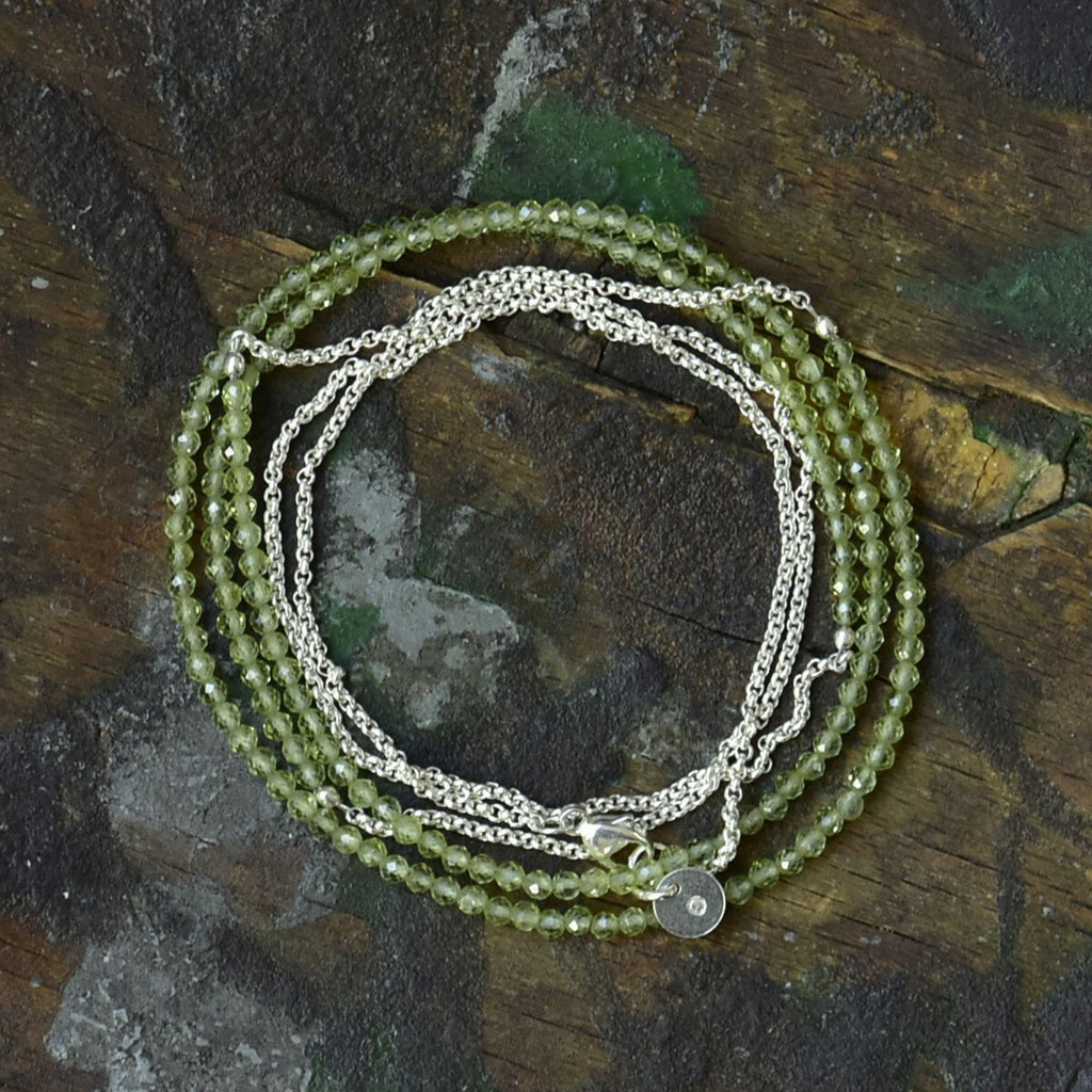 Die Wicklungen am Handgelenk sehen von jeder Seite anders aus. Als Kette getragen wirkt das Armband schlicht und zurückhaltend. Das wird besonders durch die vier gleichlangen Abschnitte von Perlen und Kette verstärkt.