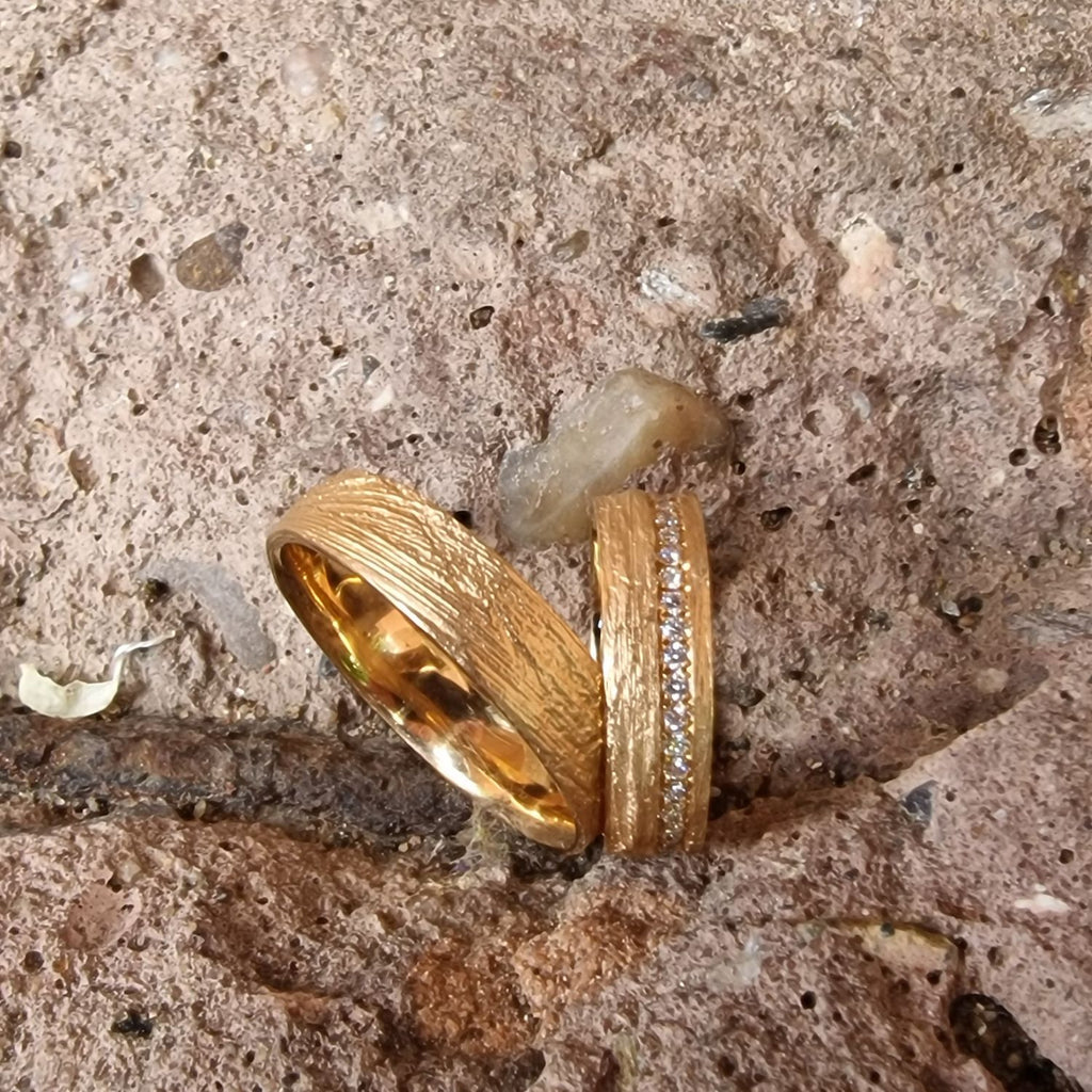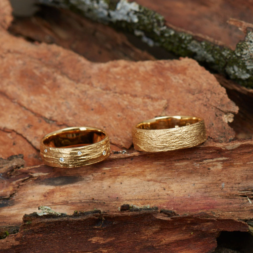 Grasringpaar in Gelbgold in verschiedenen Ausführungen in Kombination mit einem Embrace-Ring mit Verdelith