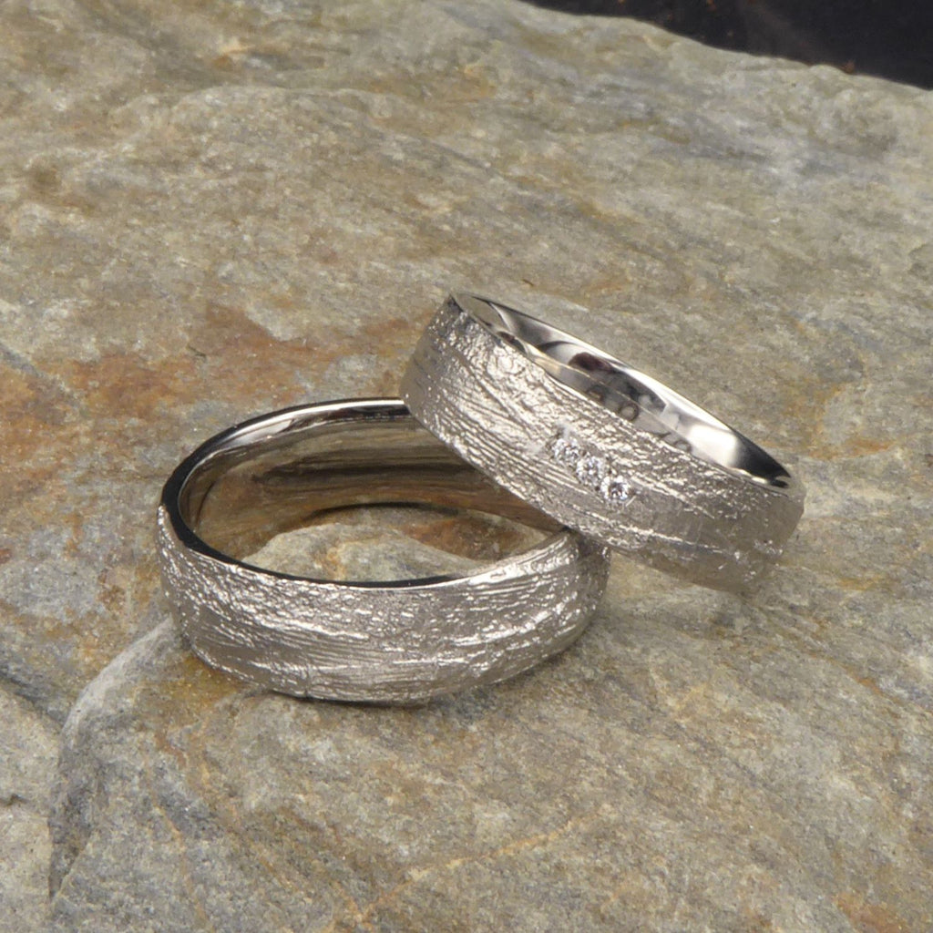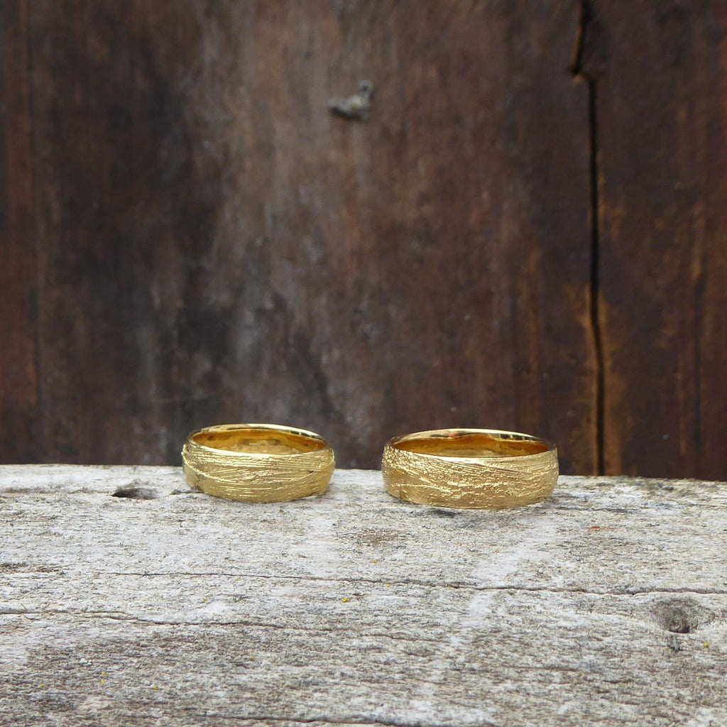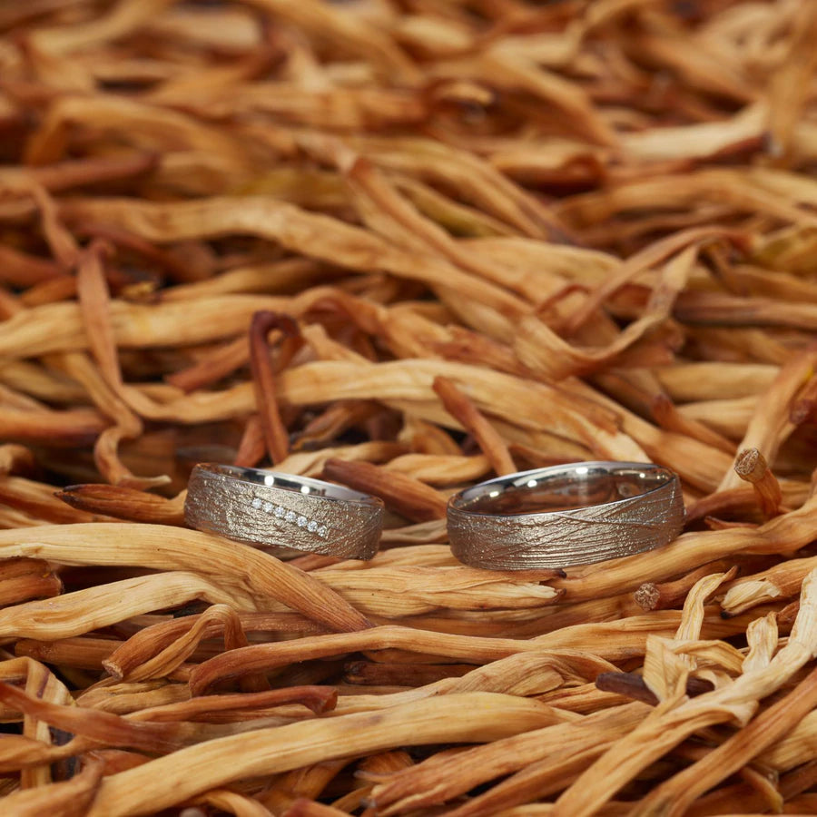 Grasringe mit 6 mm breite in Gelbgold 585 in Kombination mit einem Grasring in 2 mm Breite in Palladiumweißgold 585