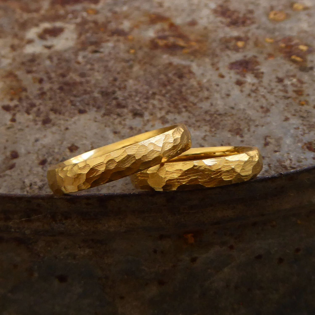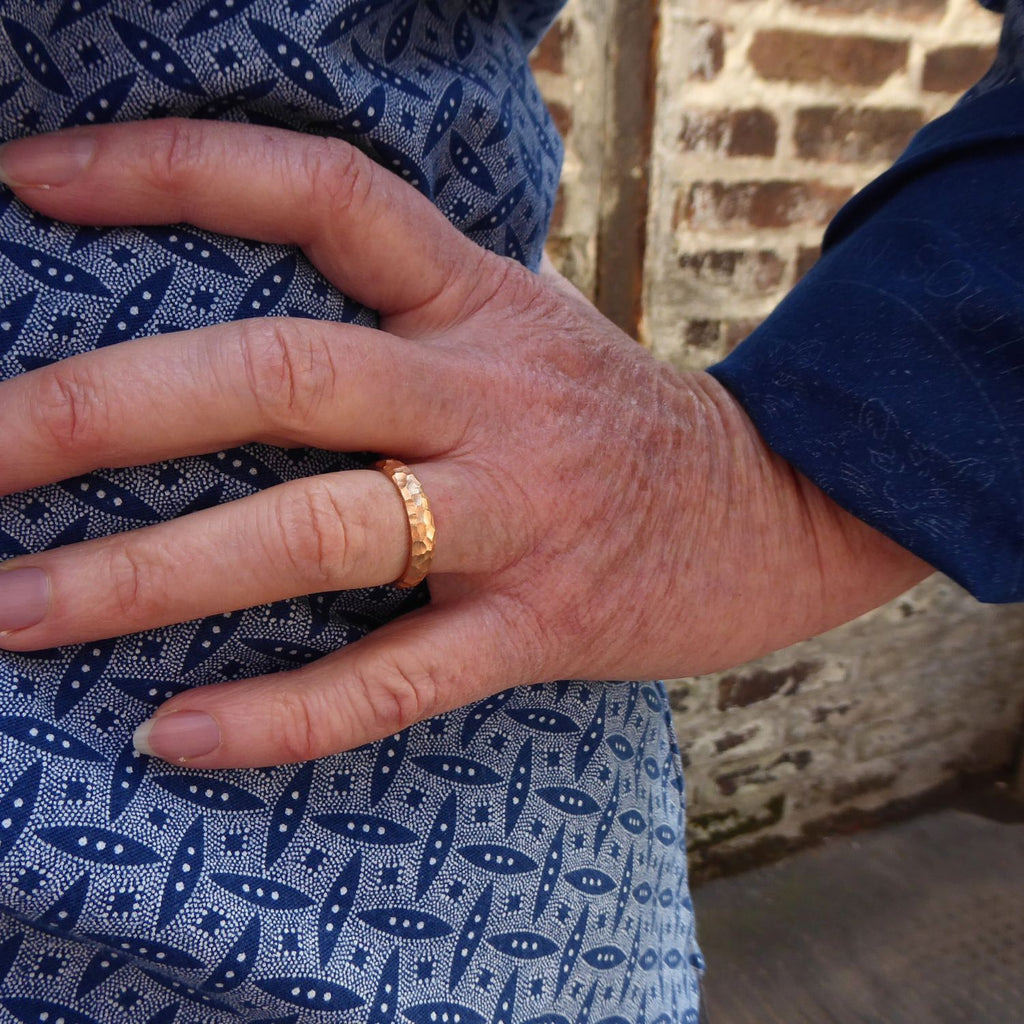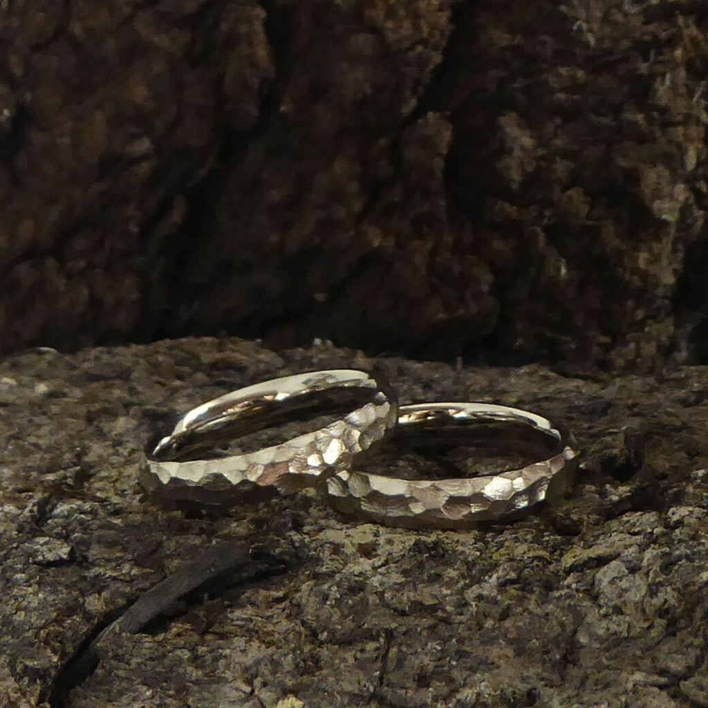 Trotz der Lebhaften Oberfläche sind die Ringe angenehm weich im Tragegefühl. Die innen abgerundete und polierte Form schmiegt sich sanft Eure Finger an.